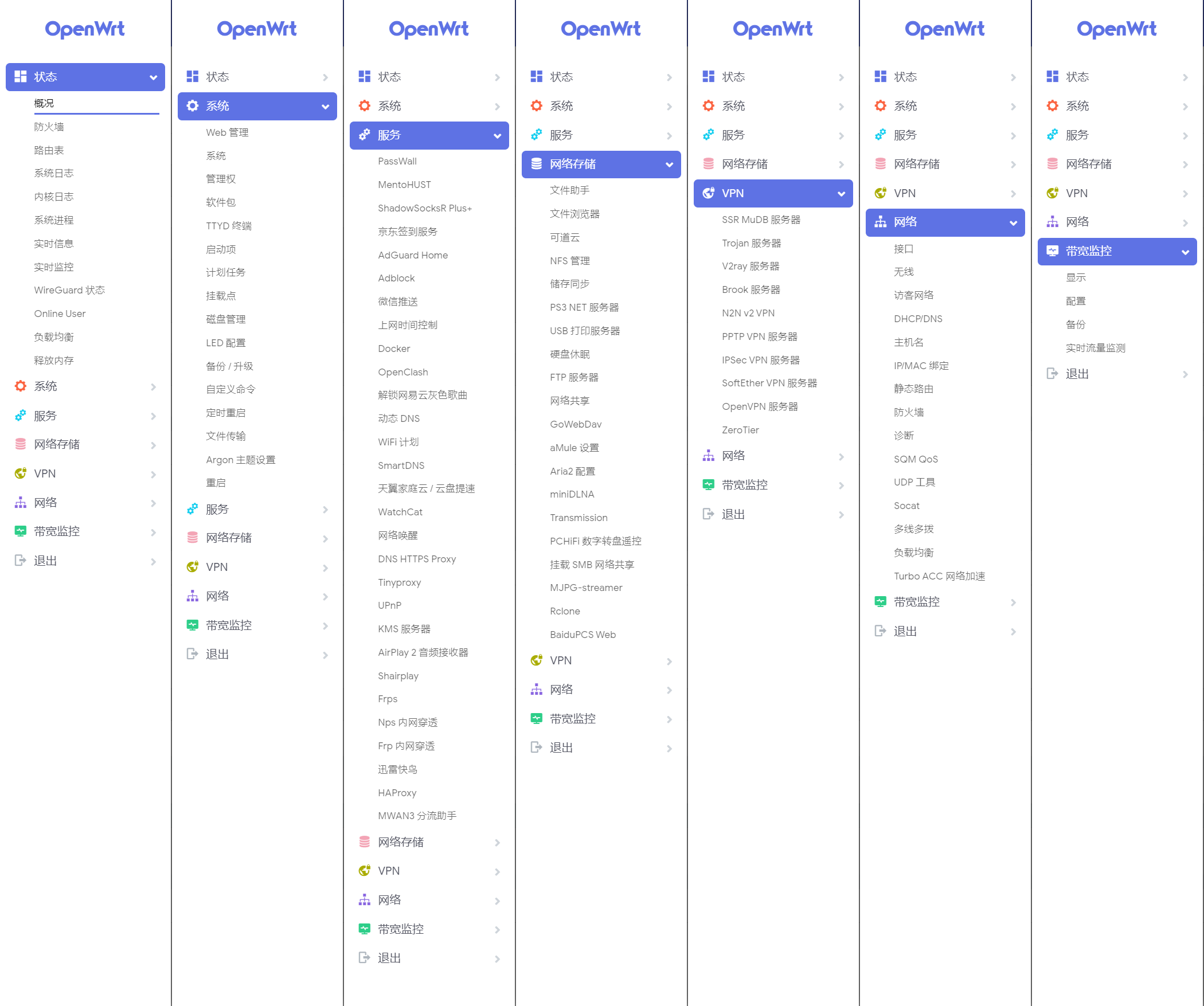 # 原文地址 本文转载自:[美丽应用](https://mlapp.cn/369.html "美丽应用") ### 写在前面 OpenWrt 是适合于嵌入式设备的一个 Linux 发行版,小苏为大家带来的是自己编译的 OpenWrt 固件~ 经过很长时间的打磨 (咕咕),“自编译 OpenWrt 固件” 现已支持树莓派全系设备(1B~4B),竞斗云,NanoPi R2S 和 x86 (64 位和 32 位) 设备。 得益于 Github Action 的支持,在之后的版本中,固件将会基于 Github Action 进行更新,暂定每日更新一个版本。这种 “偏向激进” 的更新策略可以让大家以最快速度体验到上游源码和第三方包项目在 OpenWrt 上提交的优化和新特性,当然可能会出现一些 Bug 和不稳定因素,但考虑到折腾 OpenWrt 的目标用户都是 “极客” 用户,长远来说,这种更新策略应该利大于弊。 固件所在项目地址: https://github.com/SuLingGG/OpenWrt-Rpi ### 快速通道 **我不想读文档,请将我快速传送到:** **[固件下载说明](https://mlapp.cn/1007.html "固件下载说明") | [各文件区别](https://mlapp.cn/1004.html "各文件区别") | [旁路由设置指南](https://mlapp.cn/1008.html "旁路由设置指南") | [网卡支持与推荐](https://mlapp.cn/1009.html "网卡支持与推荐") | [IPV6指南](https://mlapp.cn/1005.html "IPV6指南")** **如果以上五篇内容未能解决你的问题,请认真阅读文档。** ### 固件特色 1.本项目提供适配于 树莓派全系设备 (1~4)、NanoPi R2S/R4S (Beta)、竞斗云 2.0 以及 x86 平台的 OpenWrt 固件 2.包含丰富的 OpenWrt 原版 LuCI 插件及社区 LuCI 插件 3.集成绝大多数有线、无线、3G/4G 网卡驱动,无需另外安装 4.预置最新版 Clash 核心、预置 oh-my-zsh 以最大程度减少配置成本 5.预置所有 kmod ipk 软件包于固件内,预配置本地 opkg 软件源,远离 kmod 冲突 6.比较全面的 IPV6 支持,固件内置 IPV6 CLI 配置工具,可快速安装/卸载/配置 IPV6 7.每日凌晨 2:00 拉取最新 OpenWrt 源码及社区插件源码编译并提供分流下载,确保始终获得最新体验 8.提供 packages-server (包含 WEB 服务器的软件包归档),可在 Windows 下快速建立局域网软件源 9.对于高级用户,提供 OpenWrt Image Builder、OpenWrt SDK、OpenWrt 工具链 10.若在固件使用前与使用过程中遇到任何功能问题,请先查阅本篇文章所述内容,若仍没有得到满意答案,可以在 [OpenWrt-Rpi](https://github.com/SuLingGG/OpenWrt-Rpi "OpenWrt-Rpi") 项目中提交 Issues 或通过以下方式咨询: 11.联系方式:[ QQ 群](https://jq.qq.com/?_wv=1027&k=5RkQisS " QQ 群") / [Telegram 群组](https://t.me/joinchat/Fc-MpxcaH3mEPA4yOMtJPQ "Telegram 群组") / [Telegram 频道](https://t.me/beautifulapps "Telegram 频道") (其中 QQ 群为主力联系方式,Telegram 群组为备用联系方式,Telegram 频道将推送一些固件及文章更新内容的通知) ### 设备支持情况 | 支持设备/版本(内核) | Lean (5.4) | Offical (5.4) | Project (5.4) | | ------------ | ------------ | ------------ | ------------ | | 竞斗云 | [✅](https://github.com/SuLingGG/OpenWrt-Rpi/actions/workflows/build-gdock-lean-openwrt.yml?query=is%3Asuccess "✅") | - | [✅](https://github.com/SuLingGG/OpenWrt-Rpi/actions/workflows/build-gdock-project-openwrt.yml?query=is%3Asuccess "✅") | | 树莓派 1B | [✅](https://github.com/SuLingGG/OpenWrt-Rpi/actions/workflows/build-rpi1-lean-openwrt.yml?query=is%3Asuccess "✅") | [✅](https://github.com/SuLingGG/OpenWrt-Rpi/actions/workflows/build-rpi1-offical-openwrt.yml?query=is%3Asuccess "✅")| - | | 树莓派 2B | [✅](https://github.com/SuLingGG/OpenWrt-Rpi/actions/workflows/build-rpi2-lean-openwrt.yml?query=is%3Asuccess "✅") | [✅](https://github.com/SuLingGG/OpenWrt-Rpi/actions/workflows/build-rpi2-offical-openwrt.yml?query=is%3Asuccess "✅") | - | | 树莓派 3B/3B+ | [✅](https://github.com/SuLingGG/OpenWrt-Rpi/actions/workflows/build-rpi3-lean-openwrt.yml?query=is%3Asuccess "✅") | [✅](https://github.com/SuLingGG/OpenWrt-Rpi/actions/workflows/build-rpi3-offical-openwrt.yml?query=is%3Asuccess "✅") | - | | 树莓派 4B | [✅](https://github.com/SuLingGG/OpenWrt-Rpi/actions/workflows/build-rpi4-lean-openwrt.yml?query=is%3Asuccess "✅")| [✅](https://github.com/SuLingGG/OpenWrt-Rpi/actions/workflows/build-rpi4-offical-openwrt.yml?query=is%3Asuccess "✅") | - | | NanoPi R2S/R4S | [✅](https://github.com/SuLingGG/OpenWrt-Rpi/actions/workflows/build-rockchip-lean-openwrt.yml?query=is%3Asuccess "✅") | - | - | | x86_64 (64位) | [✅](https://github.com/SuLingGG/OpenWrt-Rpi/actions/workflows/build-x86_64-lean-openwrt.yml?query=is%3Asuccess "✅") | - | - | | x86_generic (32位) | [✅](https://github.com/SuLingGG/OpenWrt-Rpi/actions/workflows/build-x86_generic-lean-openwrt.yml?query=is%3Asuccess "✅") | - | - | ### 相关文档 由于内容过多,为增加可读性,现将各板块内容分拆为单独文章加以介绍: #### [固件特性:](https://mlapp.cn/1001.html "固件特性:") 分类别简要介绍固件内包含的插件和功能 #### [功能概览:](https://mlapp.cn/1002.html "功能概览:") 以展开图结构罗列固件内置功能,快速了解固件基本情况 #### [版本区别:](https://mlapp.cn/1004.html "版本区别:") 介绍各设备固件的基本情况,同时包含各固件与相关文件的描述与介绍 #### [IPV6指南:](https://mlapp.cn/1005.html "IPV6指南:") 包含借助 ipv6-helper CLI 工具快速配置 IPV6 的使用示例 #### [命令行工具:](https://mlapp.cn/1006.html "命令行工具:") 列举介绍了内置于固件内的命令行工具 #### [分区扩容指南:](https://mlapp.cn/1011.html "分区扩容指南:") 介绍了 ext4 和 squashfs 两种格式固件的根分区扩容方法 #### [固件下载说明:](https://mlapp.cn/1007.html "固件下载说明:") 介绍了固件下载的三种方式与固件下载注意事项 #### [旁路由设置指南:](https://mlapp